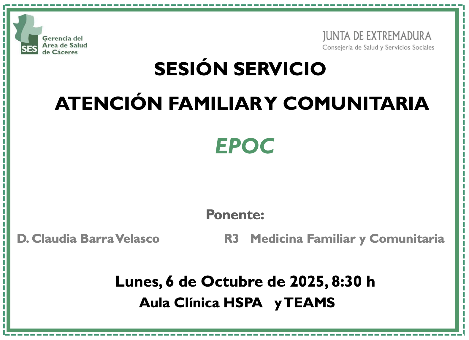 Tipo de actividad: Sesión Atención Familiar y ComunitariaPonente: Claudia Barra Velasco - R3 Atención Familiar y ComunitariaModerador/organizador: Unidad Docente Multiprofesional Atención Familiar y ComunitariaServicio: Unidad Docente Multiprofesional Atención Familiar y ComunitariaLugar: Aula Clínica del Hospital San Pedro de Alcántara - TEAMSHora: 8:30