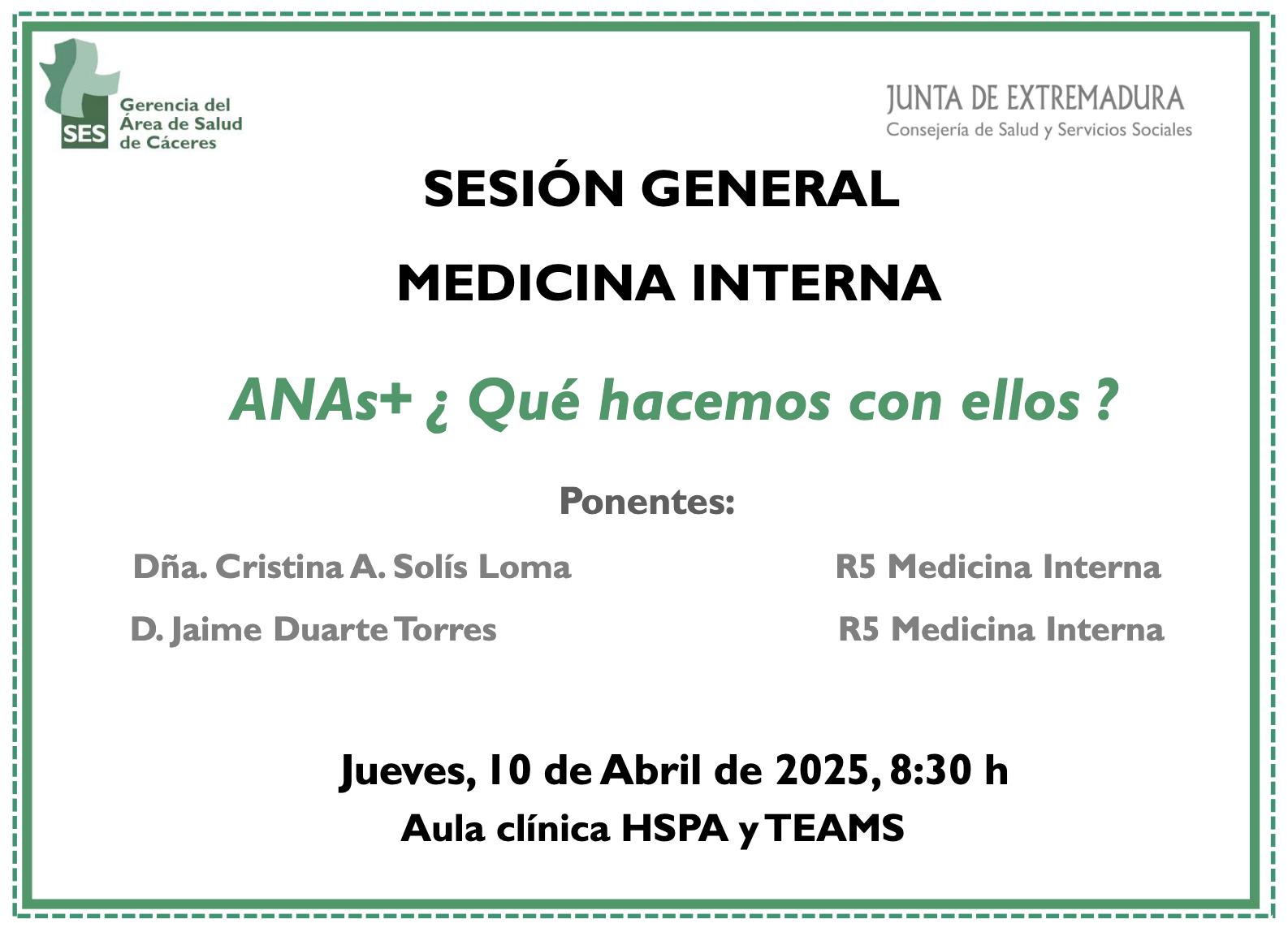 Tipo de actividad: Sesión GeneralPonente: Dña. Cristina A. Solís Loma - R5 Medicina Interna // D. Jaime Duarte Torres - R5 Medicina InternaModerador/organizador: Unidad Docente CHUCCServicio: Medicina InternaLugar: Aula Clínica del Hospital San Pedro de Alcántara - TEAMSHora: 8:30