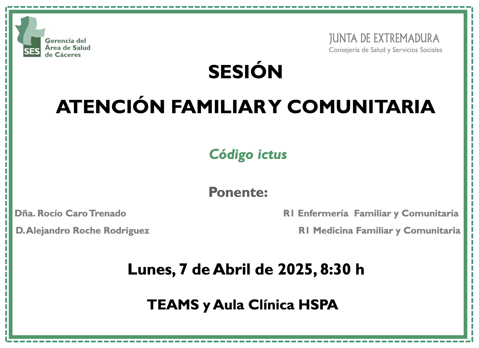 Tipo de actividad: Sesión Atención Familiar y ComunitariaPonente: Rocío Caro Trenado - R1 Atención Familiar y Comunitaria // Alejandro Roche Rodríguez - R1 Atención Familiar y ComunitariaModerador/organizador: Unidad Docente Multiprofesional Atención Familiar y ComunitariaServicio: Unidad Docente Multiprofesional Atención Familiar y ComunitariaLugar: Aula Clínica del Hospital San Pedro de Alcántara - TEAMS y aula docente Centro Salud San JorgeHora: 8:30