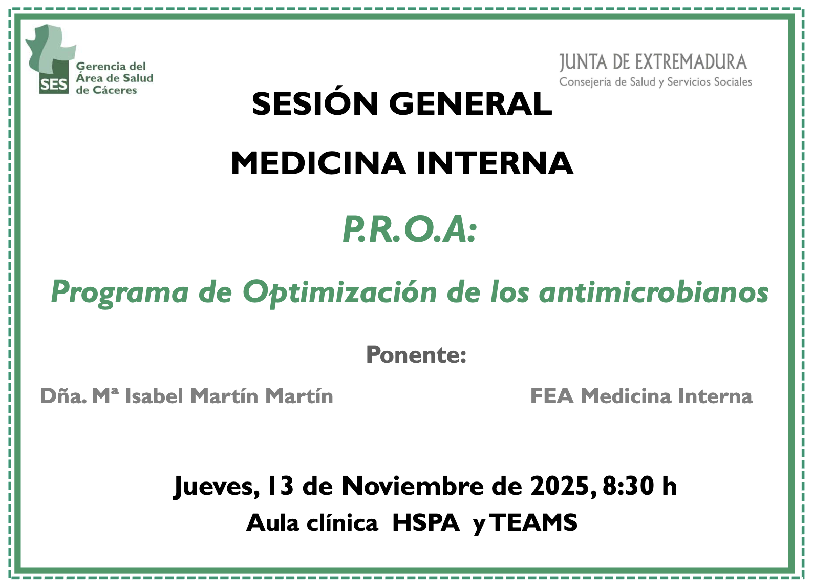 Tipo de actividad: Sesión GeneralPonente: Maria Isabel Martín Martín - FEA Medicina InternaModerador/organizador: Unidad Docente CHUCCServicio: Medicina InternaLugar: Aula Clínica del Hospital San Pedro de Alcántara - TEAMSHora: 8:30